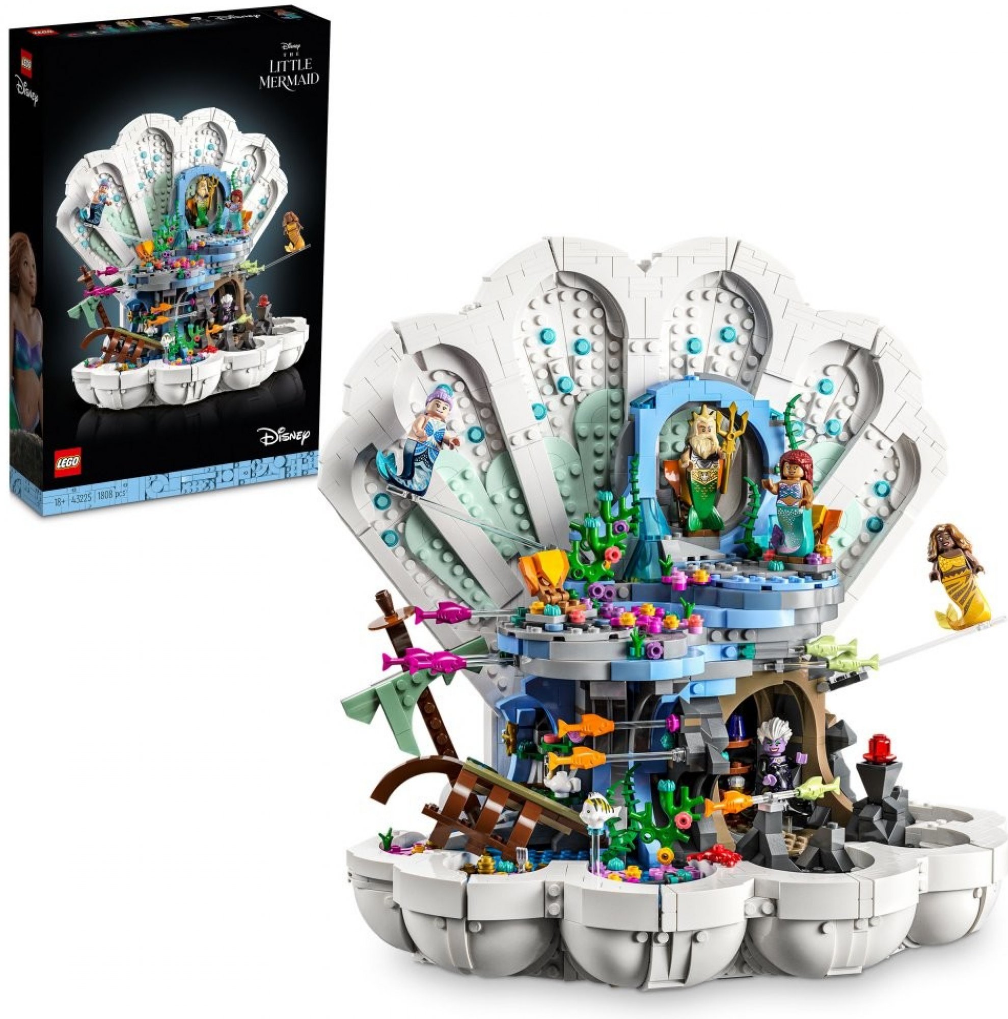 - Působivý kousek na výstavku – Tato detailní stavebnice čítá 1808 dílků a po otevření škeble v ní najdete tři místa: korunní kámen krále Tritona, Arielinu skrýš plnou pokladů a Uršulino tajemné doupě